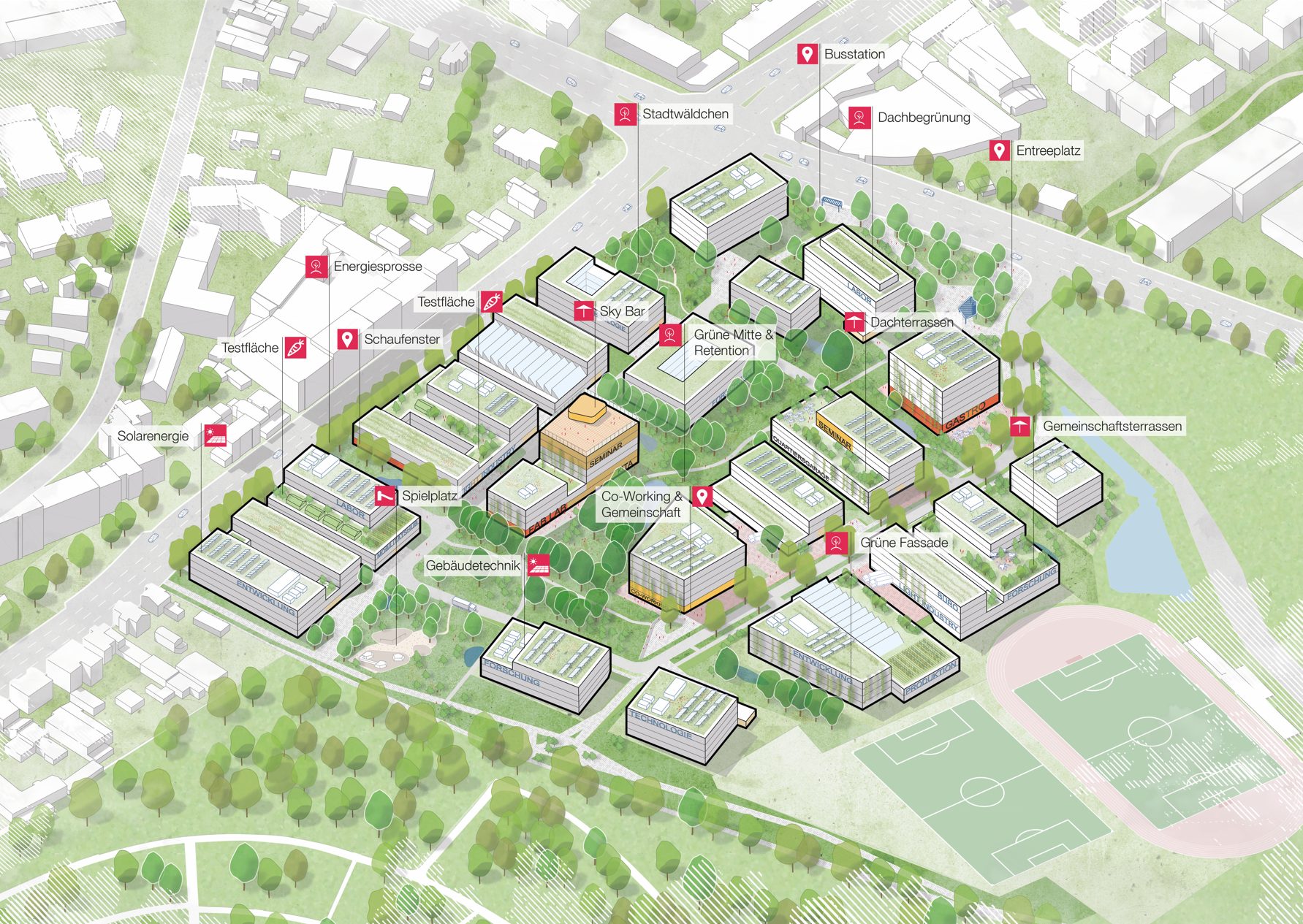 Im Hamburger Westen im Stadtteil Lurup entsteht auf einer Entwicklungsfläche von 8,5 Hektar ein neues, zukunftsweisendes Quartier. Hier werden moderne Flächen für Forschung, Labore, Start-ups, Technologie und Freizeitangebot geschaffen. Bauplätze und Gebäudetypologien basieren auf maximaler Robustheit, um auf unterschiedliche Anforderungen von künftigen Nutzer*innen reagieren zu können. Drei städtebauliche Ankerpunkte markieren strategisch wichtige Orte der Entwicklung und dienen der Orientierung. Im Herzen des Quartiers weitet sich die Landschaftsachse zur grünen Mitte mit ihren wertvollen Bestandsbäumen auf und bietet Erholungsraum für Arbeitende und Bewohnende der Nachbarschaft. Die querliegenden Energiesprossen öffnen das Quartier zur umgebenden Bebauung und bieten Energieinfrastruktur und Erholungsraum zugleich.