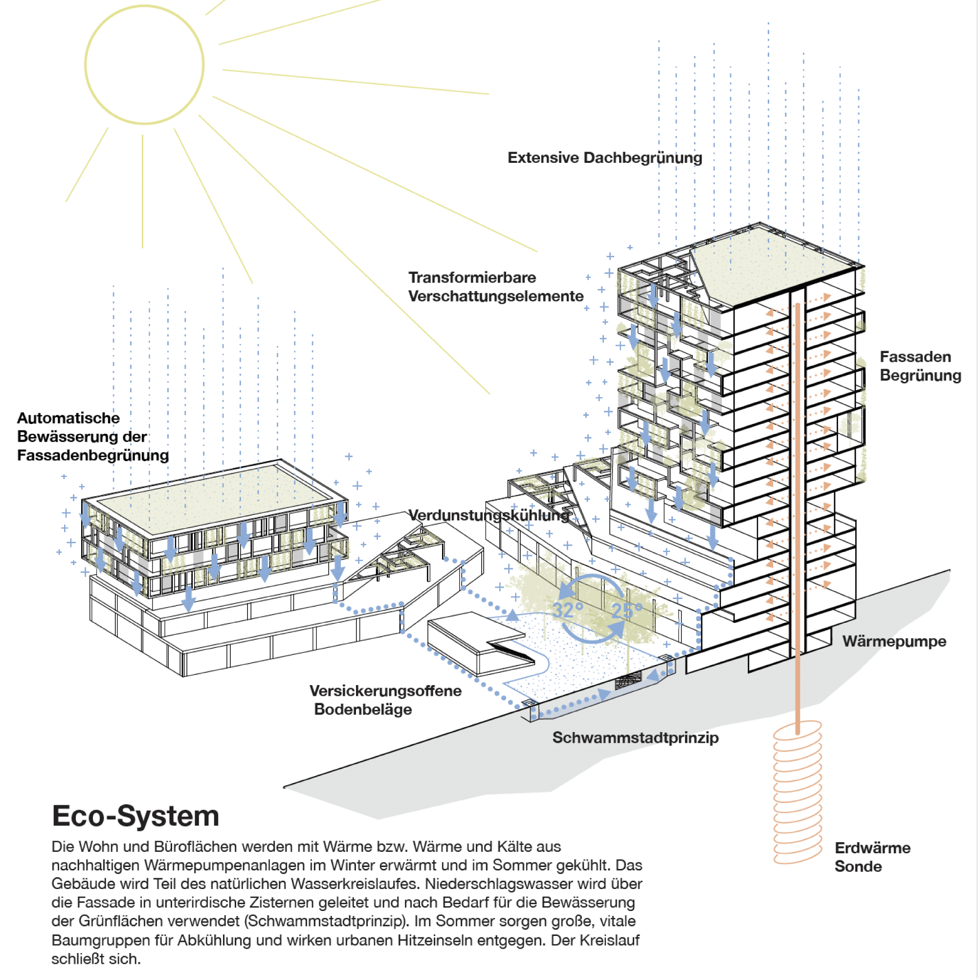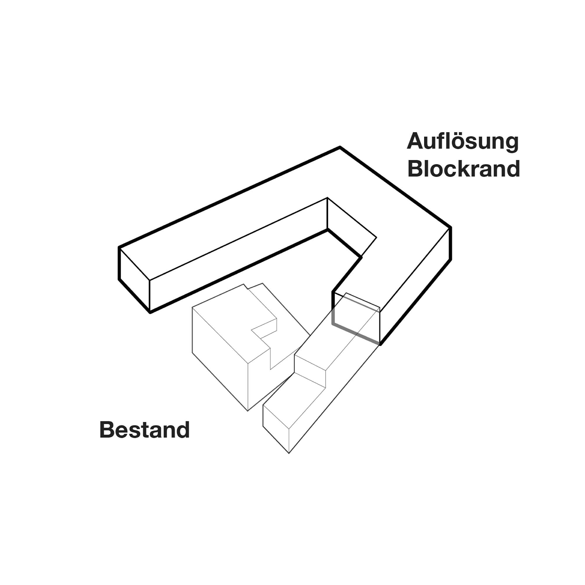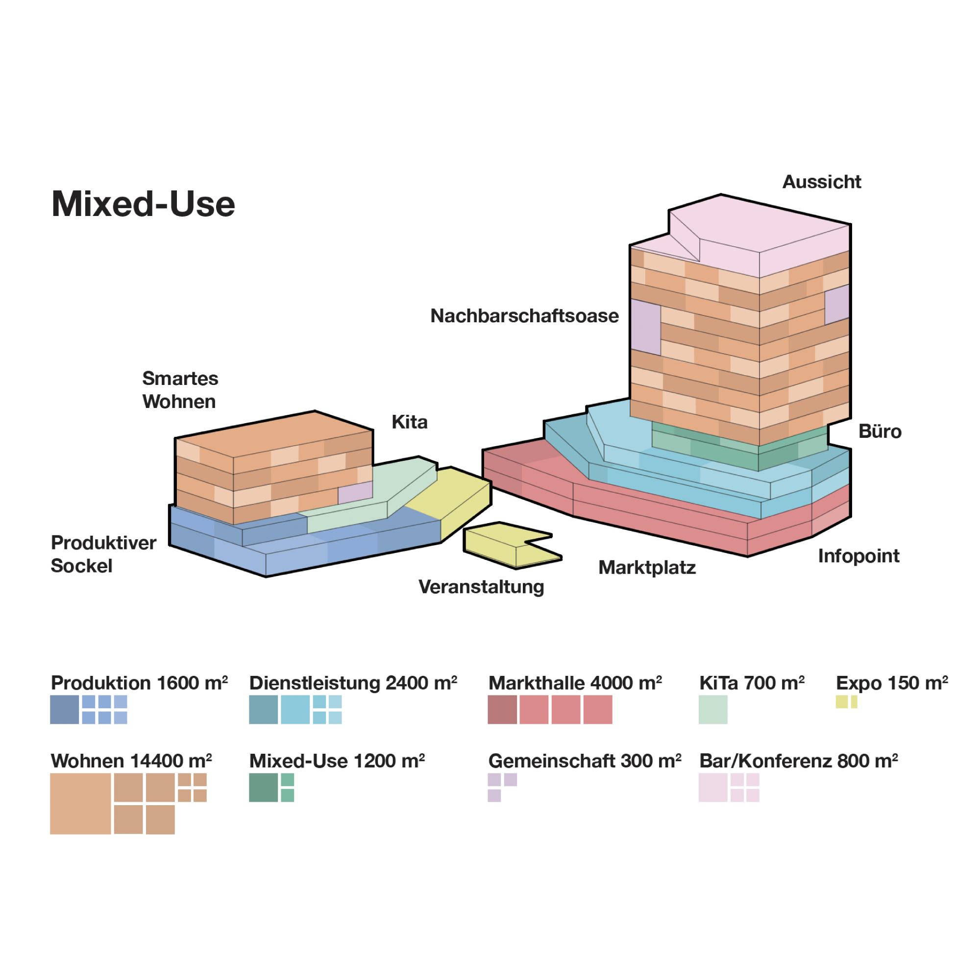 Die Grundidee des Projekts ist die Schaffung eines differenzierten und vielfältigen Wohn- und Nutzungsangebot. Besonderes Augenmerk liegt neben der Schaffung von Wohnraum-Typologien auf der Ausgestaltung der vielfältigen Freiräume, die durch die Drehbewegung der Baukörper (Terrassen) und der vertikalen Entwicklung (Landmark) ihren besonderen Charakter erhalten. Der Innenhof wird zur Begegnungszone für Produzierende, Nachbarn, Bewohner*innen. Interesse und Öffentlichkeit sind hier gewünscht. Es gibt transparente Fassaden die Einblicke in die aktiven Zonen ermöglichen. Mit drei Öffnungen wird der Blockrand intelligent aufgelöst, Vernetzung in allen Richtungen ist möglich. Die Erdgeschoß-Zonen sind mit der hohen Raumhöhe großzügig gestaltet, um Flexibilität für kommerzielle und nicht-kommerzielle Nutzungen zu ermöglichen. Der gesamte Sockel ist transparent und einsichtig.
