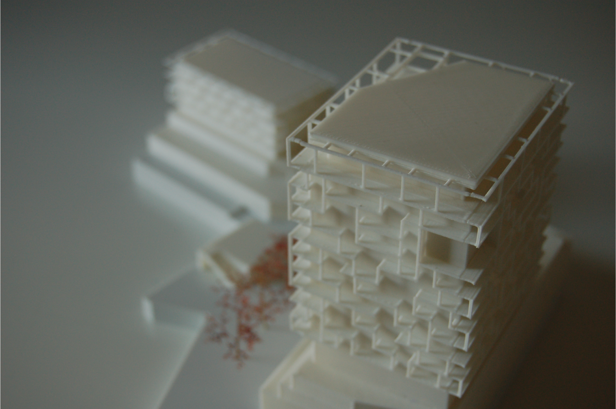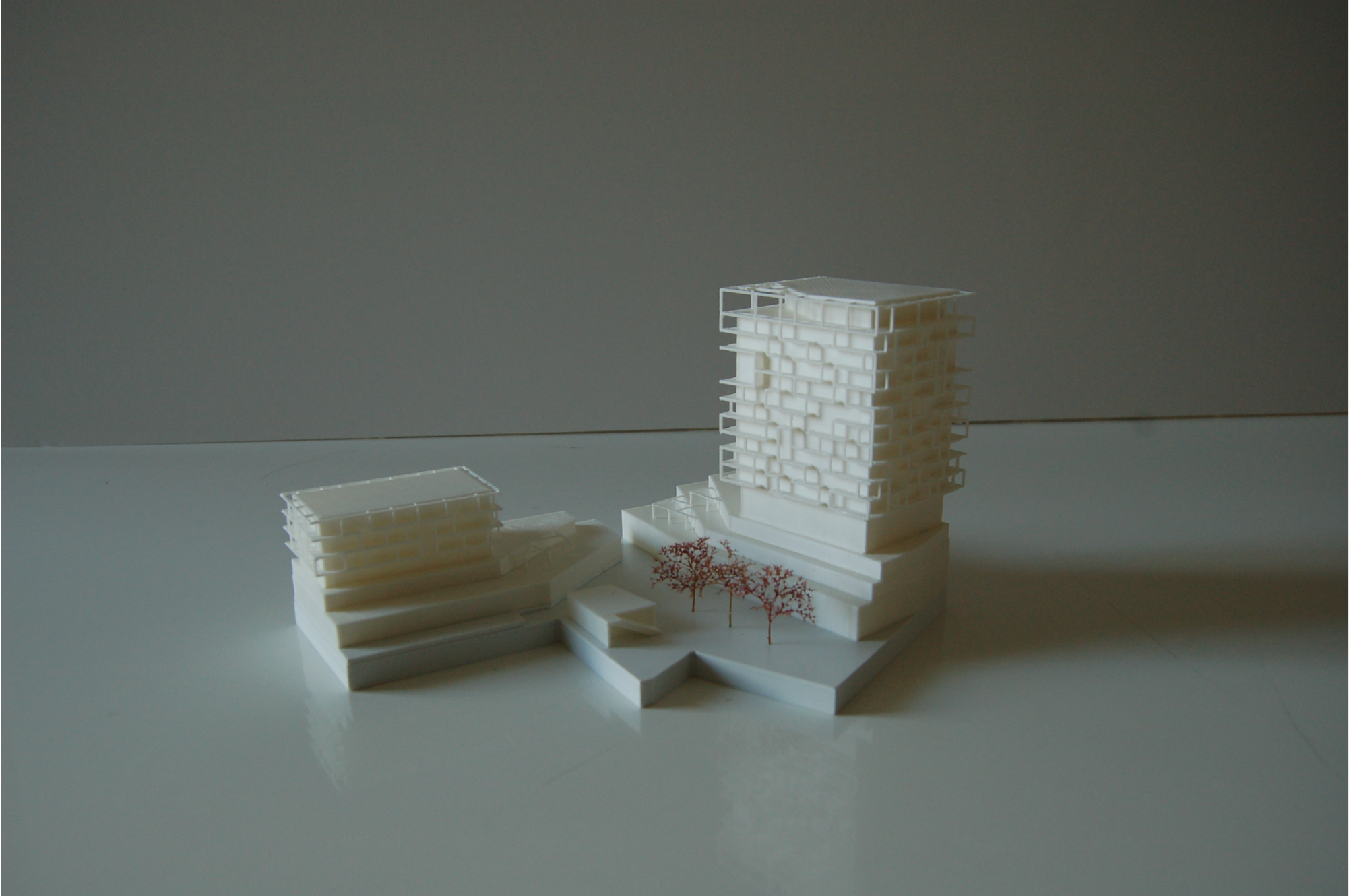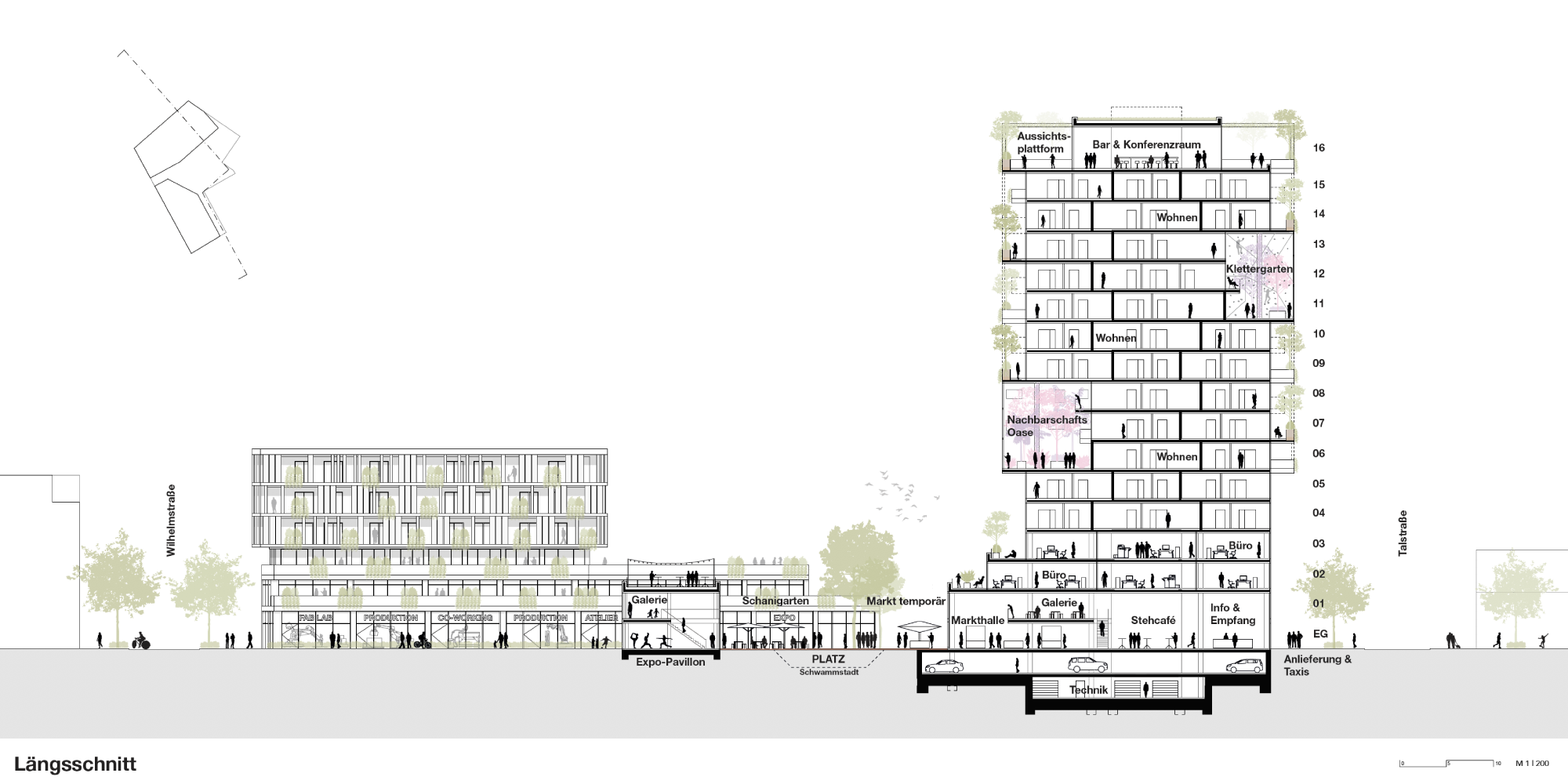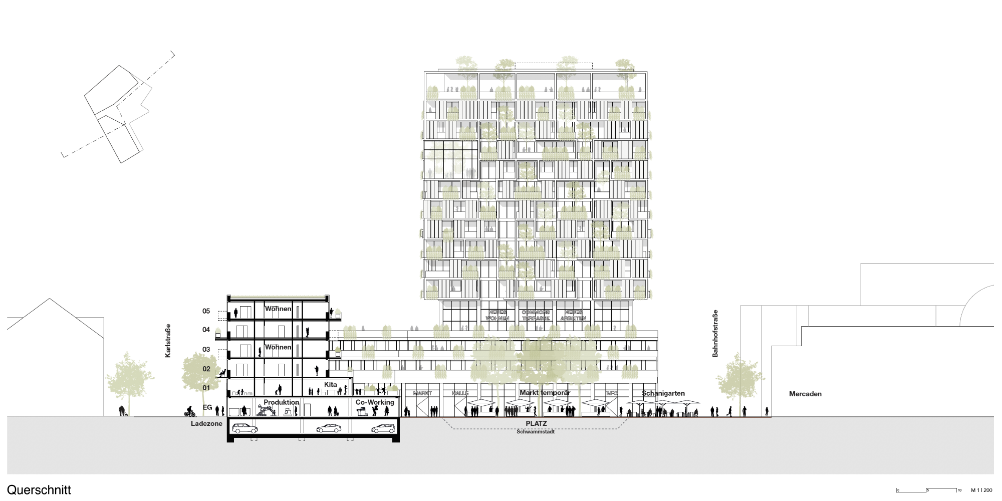 Die Grundidee des Projekts ist die Schaffung eines differenzierten und vielfältigen Wohn- und Nutzungsangebot. Besonderes Augenmerk liegt neben der Schaffung von Wohnraum-Typologien auf der Ausgestaltung der vielfältigen Freiräume, die durch die Drehbewegung der Baukörper (Terrassen) und der vertikalen Entwicklung (Landmark) ihren besonderen Charakter erhalten. Der Innenhof wird zur Begegnungszone für Produzierende, Nachbarn, Bewohner*innen. Interesse und Öffentlichkeit sind hier gewünscht. Es gibt transparente Fassaden die Einblicke in die aktiven Zonen ermöglichen. Mit drei Öffnungen wird der Blockrand intelligent aufgelöst, Vernetzung in allen Richtungen ist möglich. Die Erdgeschoß-Zonen sind mit der hohen Raumhöhe großzügig gestaltet, um Flexibilität für kommerzielle und nicht-kommerzielle Nutzungen zu ermöglichen. Der gesamte Sockel ist transparent und einsichtig.
