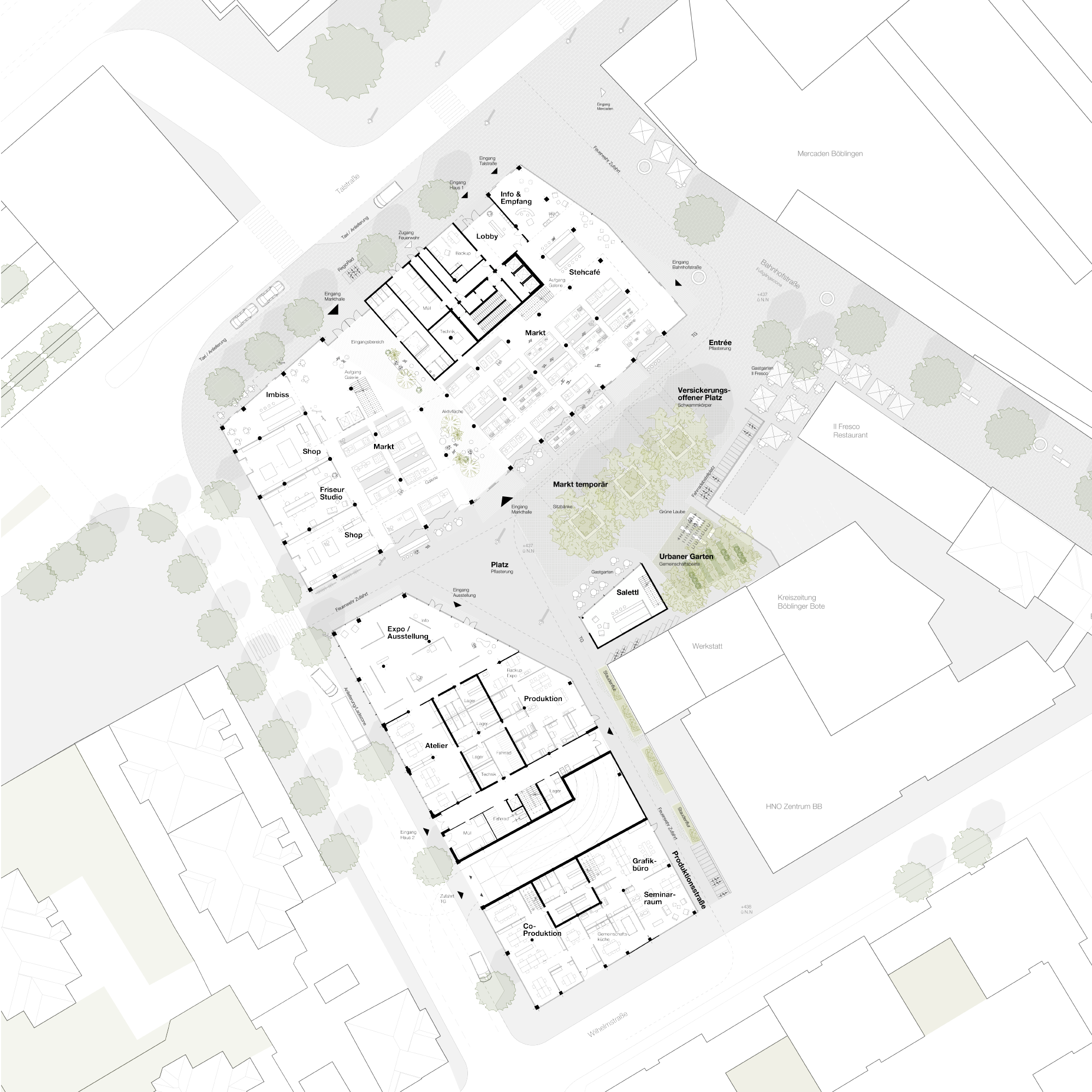 The metropolis of the future is about well-connected living space, production areas and workplaces in a close-knit network of spaces of opportunity. This is the place where Böblingen grows within its centre: the location on the railroad with climate-neutral mobility is the prerequisite for the development of the site. Here, an mixed-use urban district is emerging as a productive center of the future, from which an impulse is emanating into the metropolitan region. The diverse and active uses in the ground floor zone shape the character of the location. The vertical mix of uses becomes a land of potential and a breeding ground for productive work and independent action. Added value for the residents, neighbors and climate is created. The two buildings allow flexible ground floor zones for businesses and digital production, as well as generous hybrid production methods in flexible workshops. The holistic view of hardware (building), software (variety of uses) and orgware (management) serves as a framework to develop the neighborhood as a productive center.