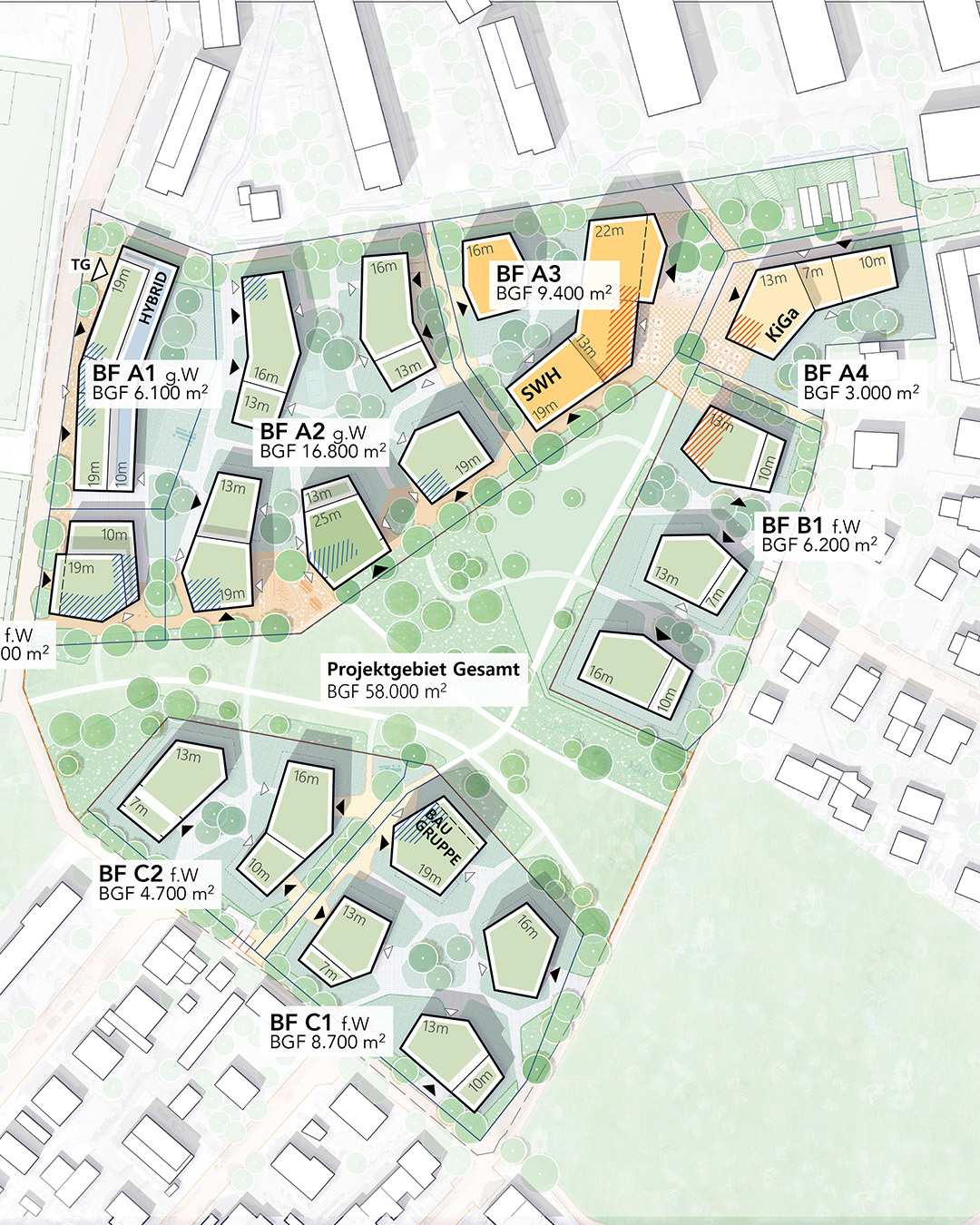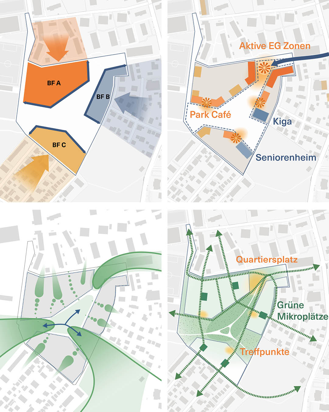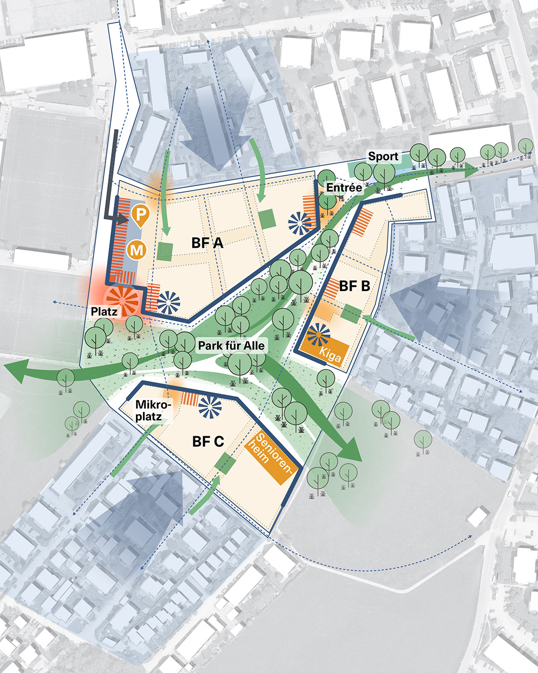 Unter dem Leitkonzept „In der Mitte das Leben“ haben wir ein lebendiges, attraktives Stadtquartier entwickelt. Der Entwurf verknüpft bestehende Landschaftsräume, ergänzt die umliegenden Siedlungen durch eine maßvolle Neubebauung und schafft eine grüne Mitte mit feingliedrigen Mikroplätzen als Nachbarschaftsoasen – wodurch ein möglichst vielfältiges Wohnen am Park ermöglicht wird.