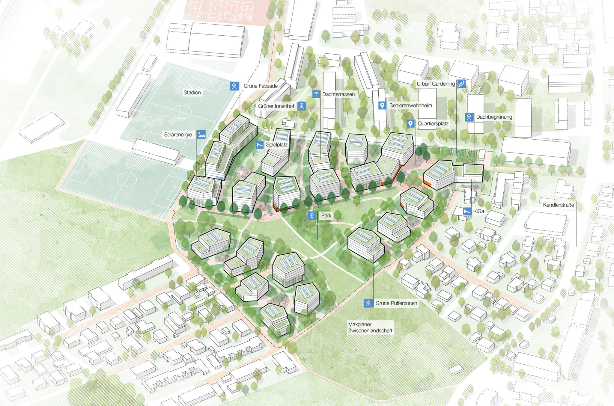 As one of the finalists in the cooperative urban-design process for “Glan Gärten,” a new urban development area in Salzburg, we developed our innovative vision for the more than 5-hectare planning site together with the landscape architecture office DnD.