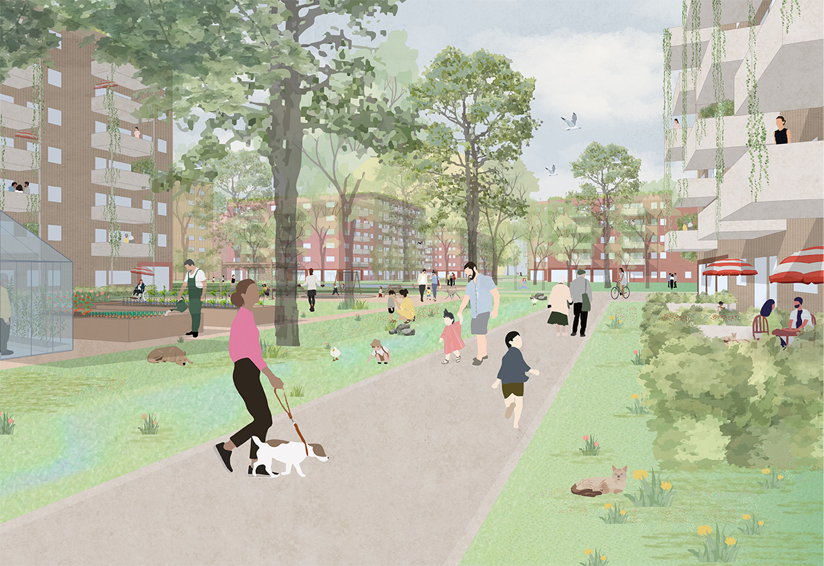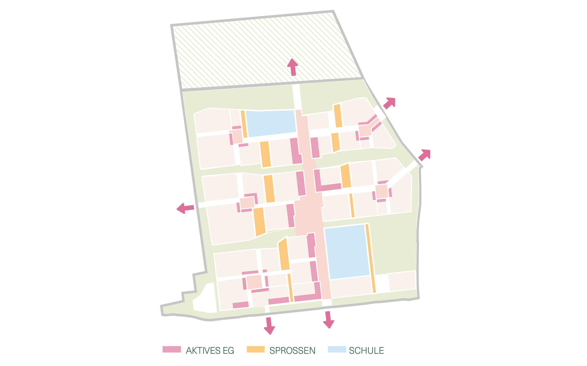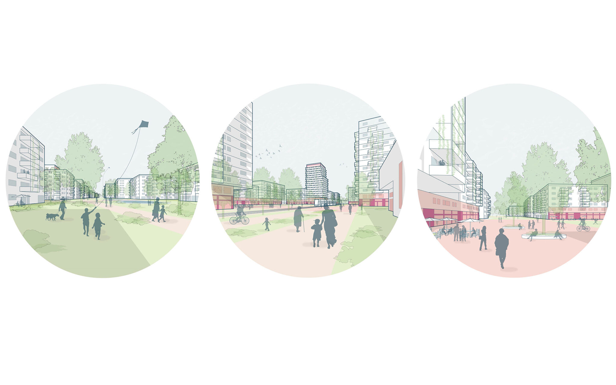 Das Projekt verbindet urbanes Wohnen mit landwirtschaftlichem Erbe und schafft ein Quartier, das von Landschaft, Klimaresilienz und Gemeinschaft geprägt ist. Ein System aus nord–südlich verlaufenden „grünen Sprossen“ und drei ausgeprägten ost–westlichen blau-grünen Korridoren strukturiert den Stadtteil — und verwebt Biodiversität, Mikroklima und Alltagsmobilität. Die grünen Rückgrate bieten eine vielfältige Mischung gemeinschaftlicher Freiräume, von blühenden Wiesen über Spielflächen bis hin zu Sportfeldern, während die Korridore Parks, Retentionslandschaften und Wasserelemente beherbergen und so ein lebendiges Netzwerk für Menschen, Flora und Fauna bilden.