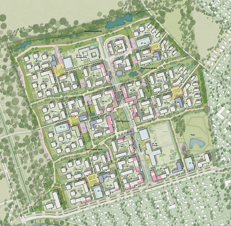 The project bridges urban living and agricultural heritage, creating a neighborhood shaped by landscape, climate resilience, and community. A system of north–south “green spines” and three strong east–west blue-green corridors structures the district — weaving together biodiversity, microclimate, and everyday mobility. The green spines offer a diverse mix of shared open spaces from blooming meadows to play areas and sports fields while the corridors host parks, retention landscapes, and water elements, forming a living network for people, flora, and fauna.