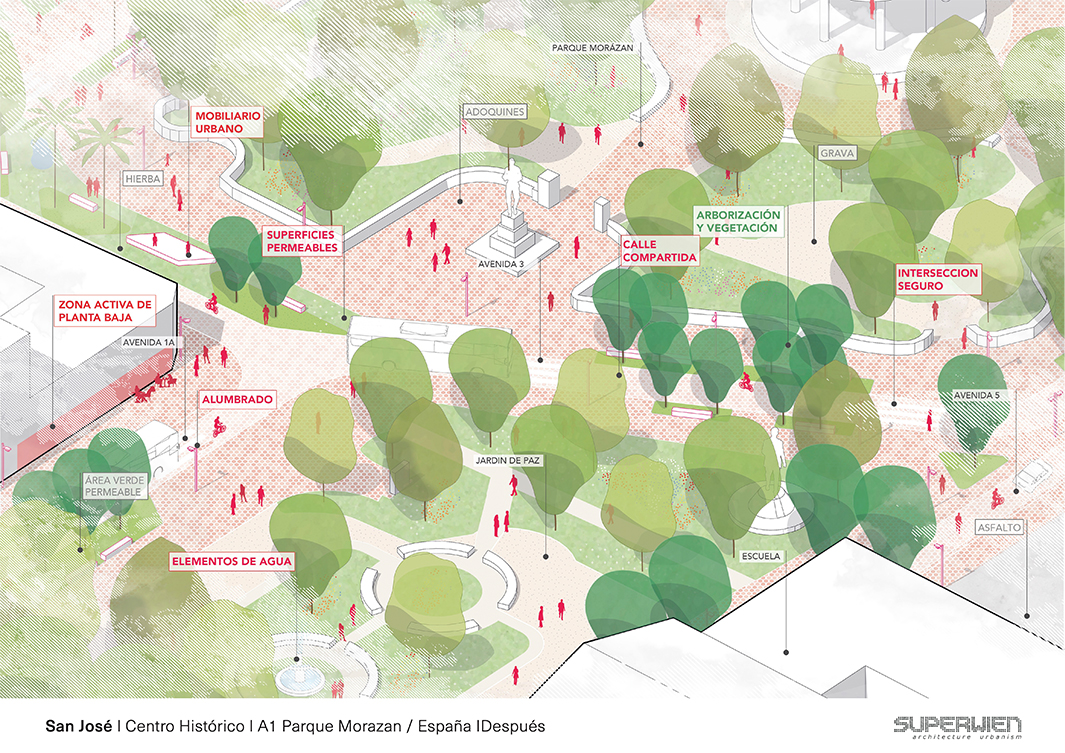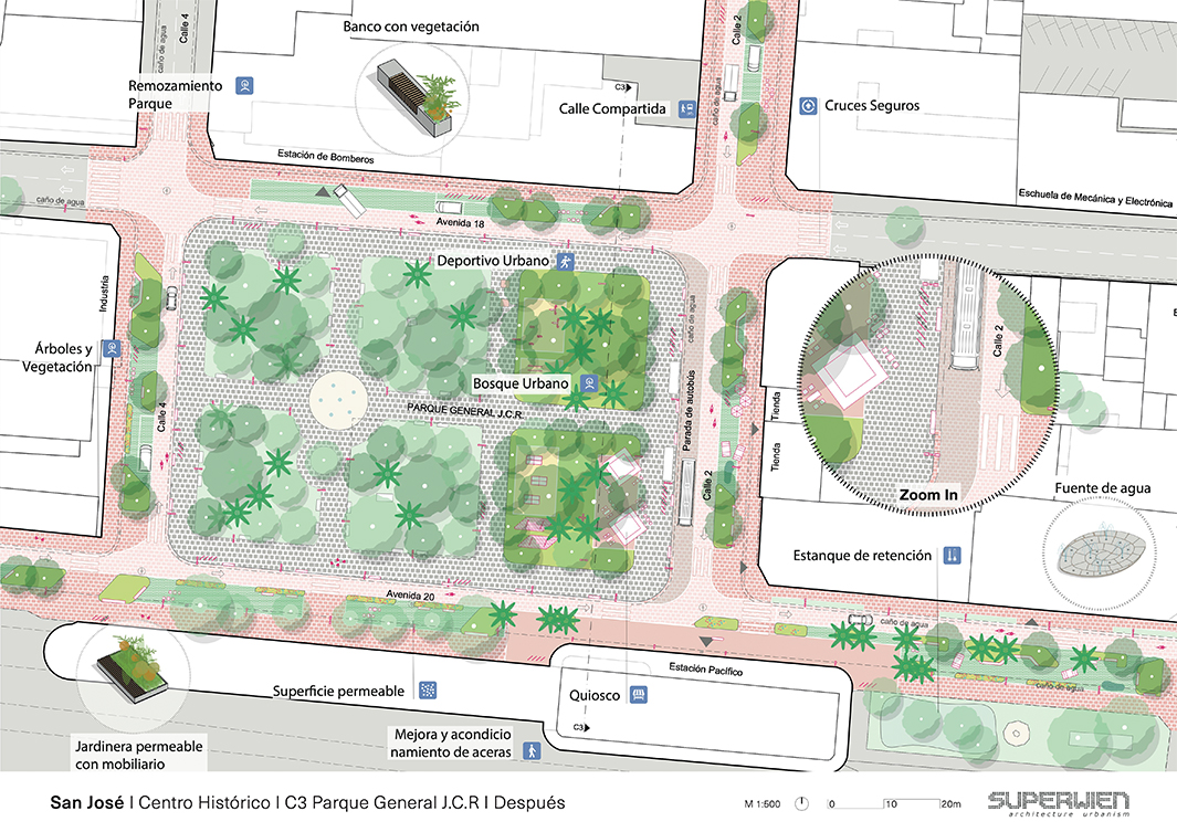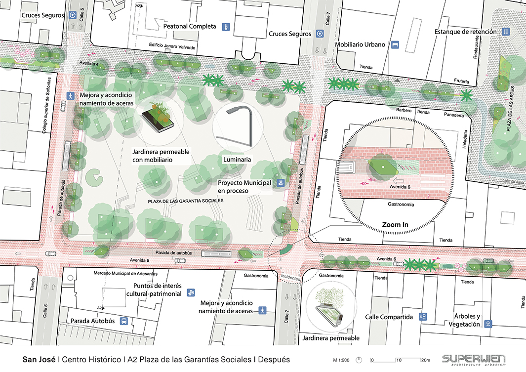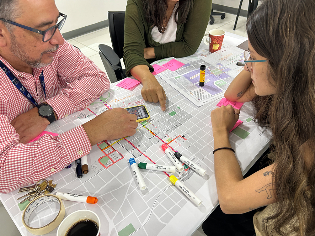 Superwien led the entire process, bringing together international expertise, local knowledge and intensive collaboration with the Municipality and IDB specialists. The work began with a comprehensive diagnostic, which involved detailed fieldwork, on-site measurements and extensive spatial analysis. The team documented the condition of sidewalks, crossings, bus stops, lighting, drainage, vegetation and accessibility across the Historic Center. These observations were complemented by a deeper evaluation of land use patterns, pedestrian flows, safety concerns, institutional presence and heritage values. Parallel to this, the environmental and climate assessment identified heat islands, areas with deficient tree canopy and segments affected by recurring flooding or inadequate stormwater management. Interviews and working sessions with municipal teams, neighborhood actors and local organizations helped clarify the challenges faced by different users and uncovered insights that guided the selection of strategic interventions.
