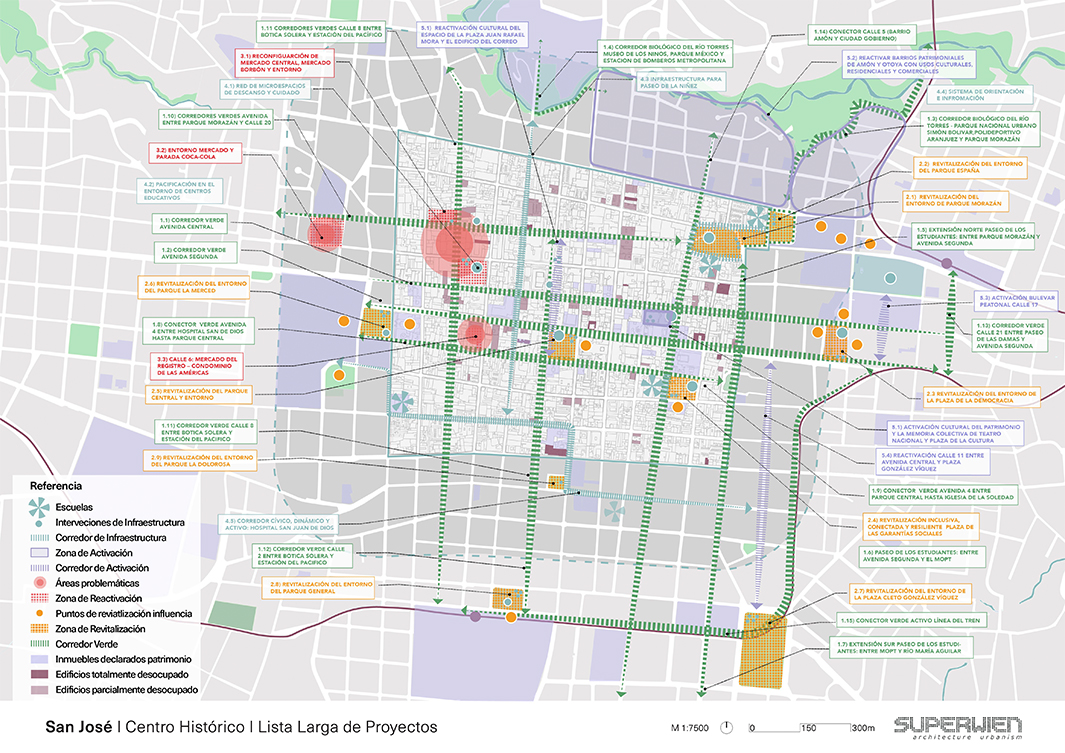 Das historische Zentrum von San José ist ein dichtes und vielfältiges Stadtgebiet, das zahlreiche kulturelle Einrichtungen, Schulen, öffentliche Gebäude, Handel und bedeutende Denkmäler vereint. Trotz dieses Potenzials hatten internationale Trends und lokale Entwicklungen über Jahre zu einer schrittweisen Erosion des öffentlichen Raums geführt: unzureichende Gehwege, unsichere Querungen, fehlende Barrierefreiheit, zunehmende Hitzeinseln, mangelnder Baumbestand und ein wachsender Bestand leerstehender oder untergenutzter Gebäude. Ziel der Vor-Machbarkeitsphase war es daher, einen klaren technischen Fahrplan auszuarbeiten, der künftige Investitionen leiten, privates Engagement anregen und die Voraussetzungen für eine inklusivere Wiederbesiedlung des Stadtzentrums schaffen sollte.