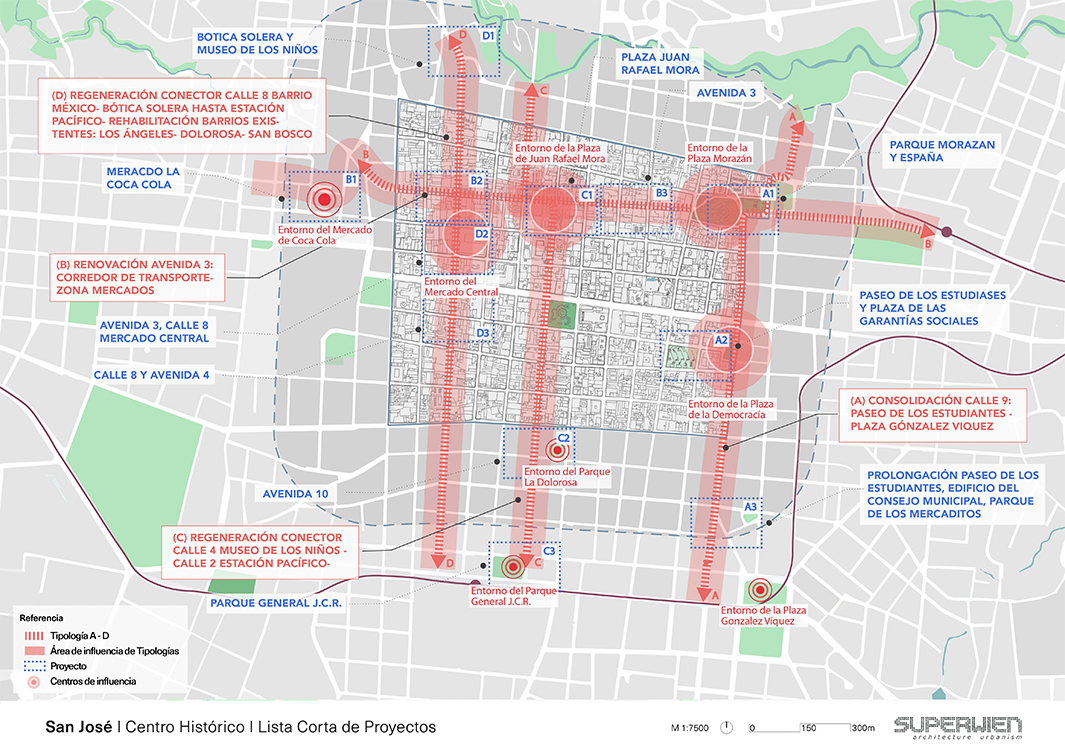 Basierend auf dieser Analyse entwickelte Superwien eine Longlist möglicher Projekte im gesamten historischen Zentrum. Diese wurden mithilfe eines mehrkriteriellen Bewertungsmodells untersucht, das soziale Wirkung, Mobilitätsvorteile, wirtschaftliches Aktivierungspotenzial, technische Realisierbarkeit, Umwelteinfluss und Übereinstimmung mit kommunalen Prioritäten berücksichtigte. In gemeinsamen Workshops mit der Stadt und der IDB wurden schließlich vier zentrale Stadtkorridore ausgewählt: Calle 9, Avenida 3, Calle 4 und Calle 8 / Barrio México. Jeder dieser Korridore erfüllte eine wichtige städtebauliche Funktion – sei es als Verbindung zwischen Schulen, kulturellen Einrichtungen, Geschäftsstraßen, Verkehrsknotenpunkten oder Wohnquartieren – und wies gleichzeitig besondere Herausforderungen hinsichtlich Verkehrssicherheit, Barrierefreiheit, Überflutungen oder räumlicher Aufenthaltsqualität auf. Zusammen bildeten sie ein kohärentes Set strategischer Interventionen, die sowohl die Konnektivität stärken als auch systemische Probleme des öffentlichen Raums adressieren würden.