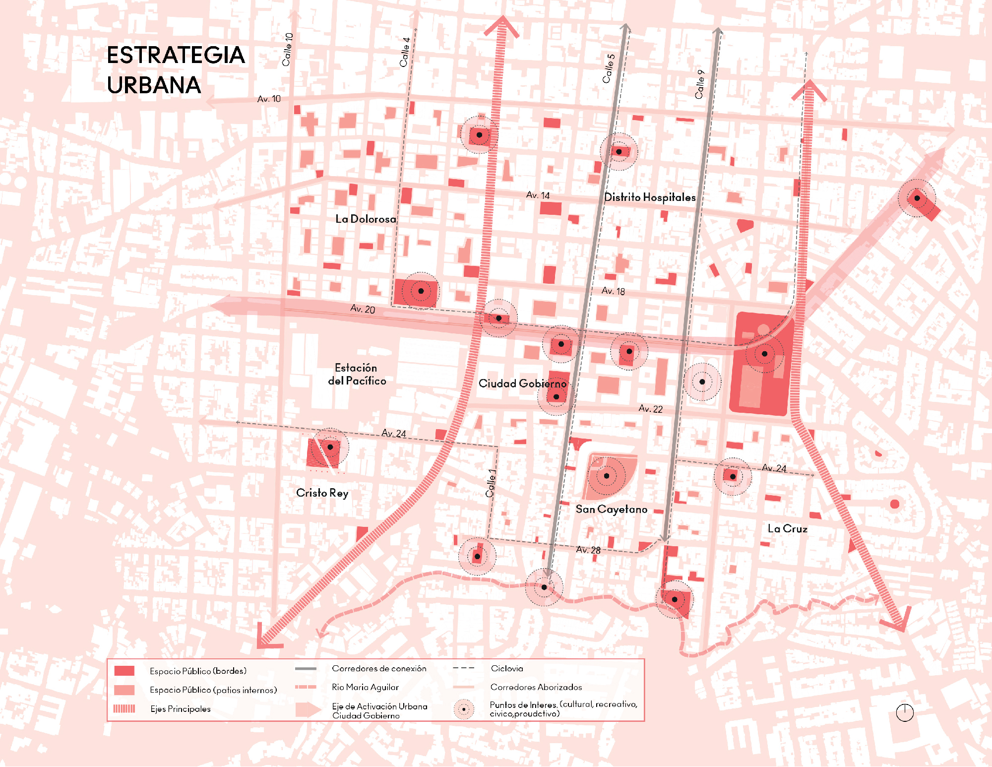 Die Strategie besteht darin, das Projekt “Ciudad Gobierno” in seinem städtebaulichen Umfeld zu kontextualisieren und sich auf die Schaffung einer neuen Zentralität um den Gonzales-Víquez Park und den El Pacífico-Bahnhof zu konzentrieren. Der Plan sieht vor, mehr als die Hälfte des Gebiets für Büro-, Geschäfts- und Wohnnutzung vorzusehen, mit sozialen Einrichtungen und der Sanierung von denkmalgeschützten Gebäuden. Der größte Teil des verbleibenden Gebiets wird als unbebaute Zonen vorgesehen, in denen offene, grüne und Erholungsflächen geschaffen werden können.
